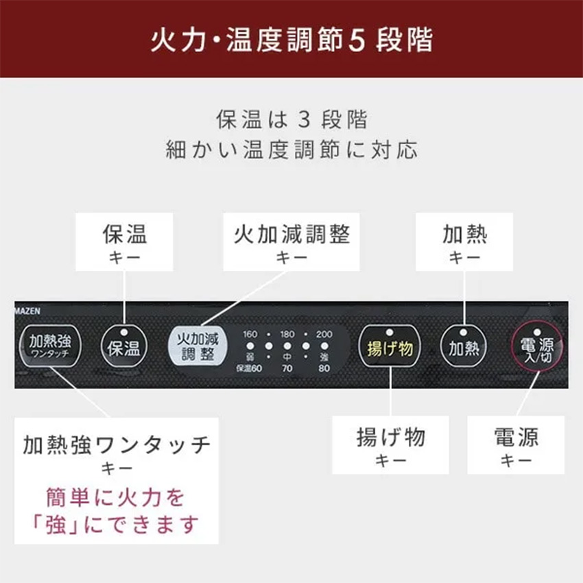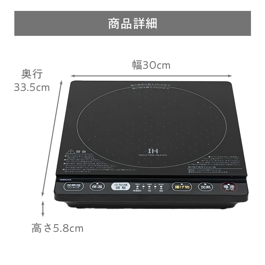 商品仕様 品名 山善 IHクッキングヒーター YEP-CS140 サイズ 幅30×奥行33.5×高さ5.8cm 重量 約2.2kg 電源コード長さ 1.9m 火力 5段階(300W~1400W) 安全機能 電源切り忘れ防止自動OFF、鍋検知センサー機能、鍋なし自動OFF、小物発熱防止自動OFF、空焚き防止自動OFF